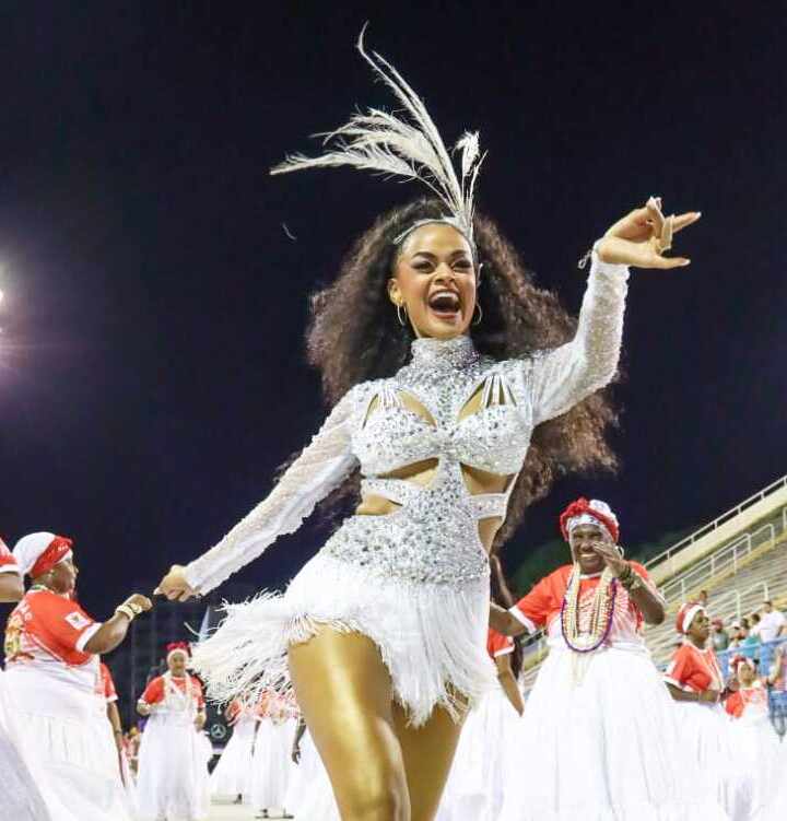 Anny Alves roubou a cena no ensaio técnico da Unidos do Porto da Pedra, na Marquês de Sapucaí, na noite deste sábado (28). A musa da escola de São Gonçalo escolheu um look branco e prata com franjas para o treino do Tigre.